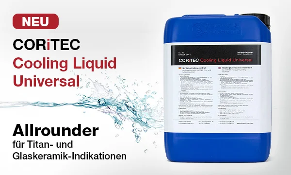 Der Universal-Kühlschmierstoff CORiTEC Cooling Liquid Universal ist für alle Indikationen (Titan- und Glaskeramikanwendungen) geeignet und vereinfacht die Logistik und Lagerhaltung.