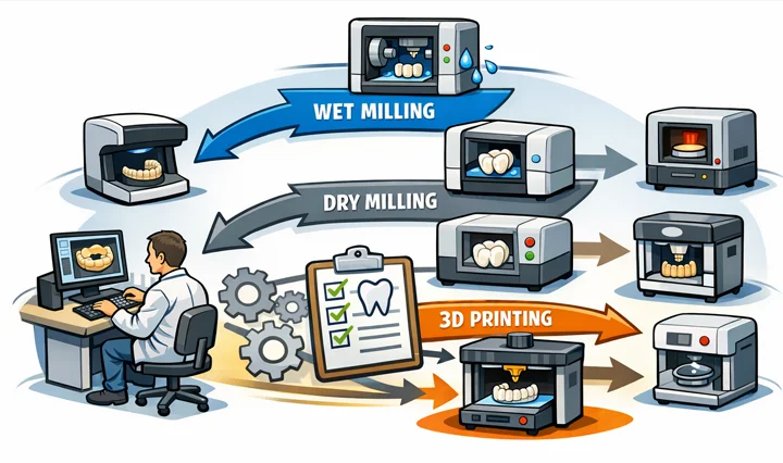 Eine praktische Frässtrategie beginnt mit der Indikation und dem Material. Eine monolithische Zirkonkrone für den routinemäßigen Einsatz im Seitenzahnbereich sollte nicht dieselben Produktionsressourcen beanspruchen wie ein hochästhetischer Frontzahnfall aus Glaskeramik oder eine individuell angefertigte Implantatversorgung. Trockenfräsen ist in der Regel der effizienteste Weg für Materialien wie vorgesintertes Zirkon und PMMA, während Nassfräsen je nach Konfiguration mit Materialklassen wie Glaskeramik und bestimmten metall- oder implantatbezogenen Anwendungen verbunden ist. Die richtige Einteilung der Fräsvorgänge reduziert die Werkzeugbelastung, verkürzt die Durchlaufzeit und verbessert die Konsistenz.