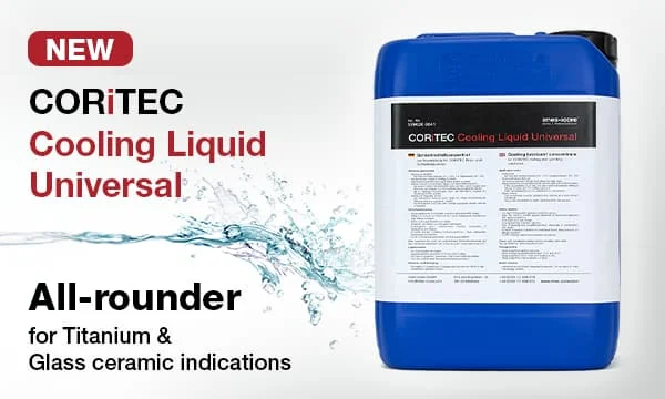 ユニバーサルクーラント潤滑剤CORiTECCooling Liquid Universalは、あらゆる適応症(チタンおよびガラスセラミック用途)に適しており、物流および在庫管理を簡素化します。
